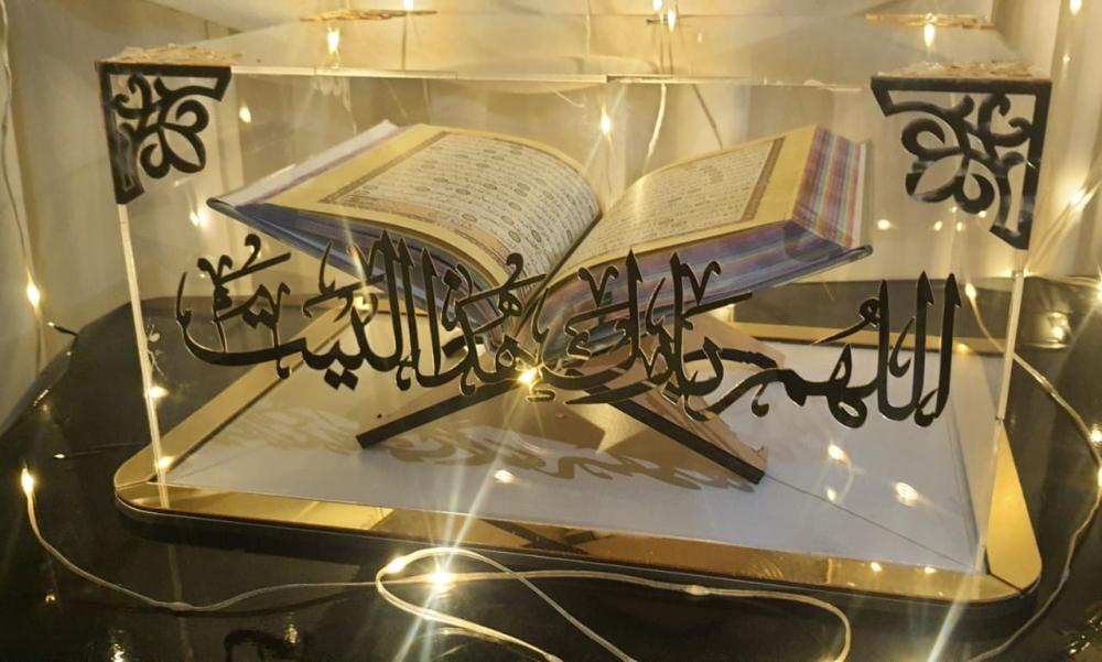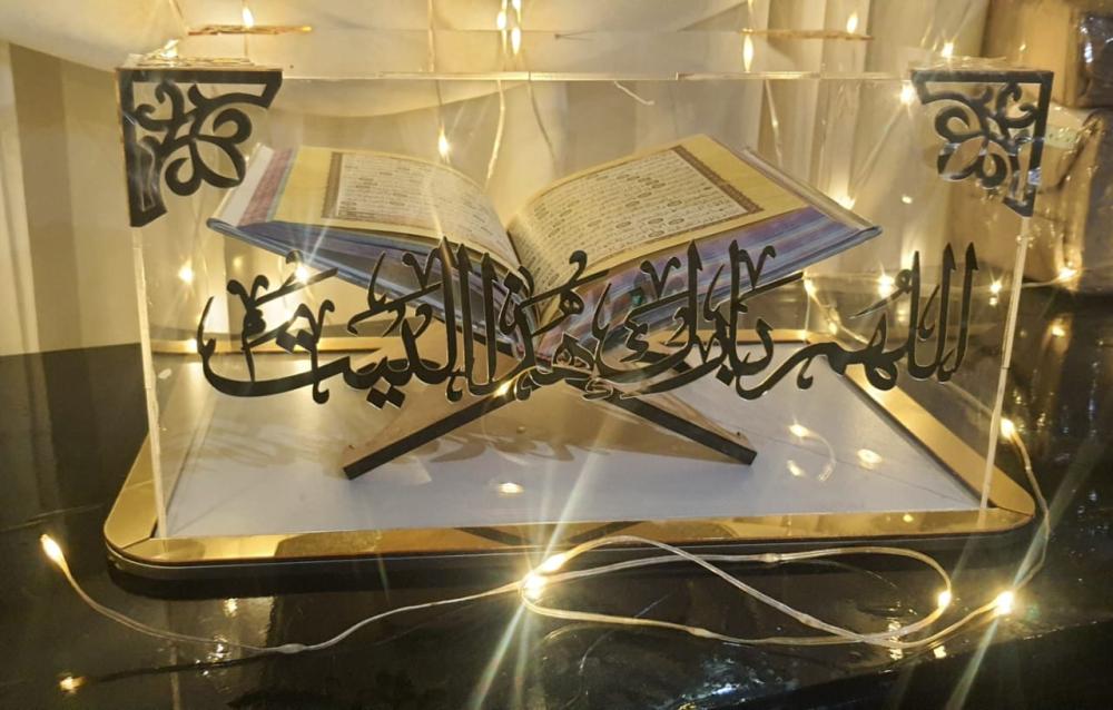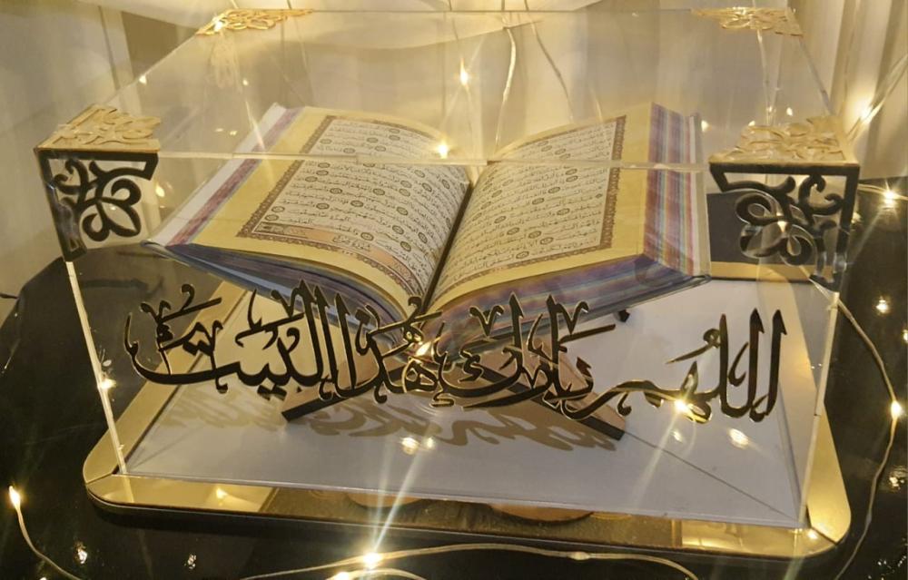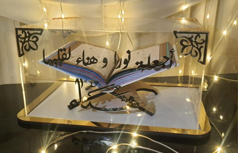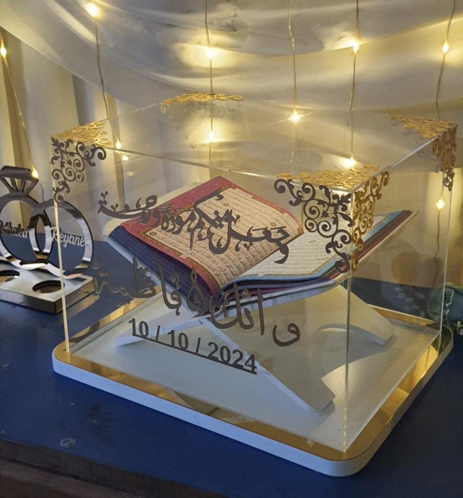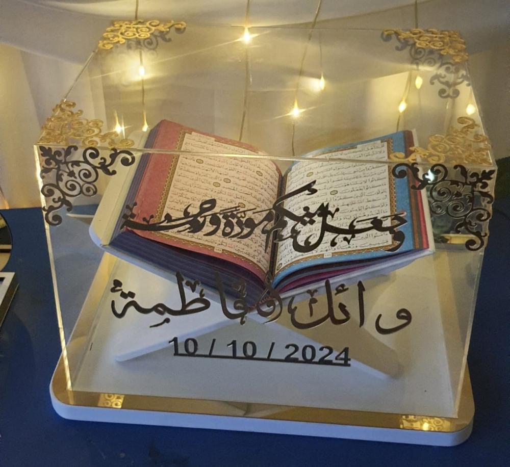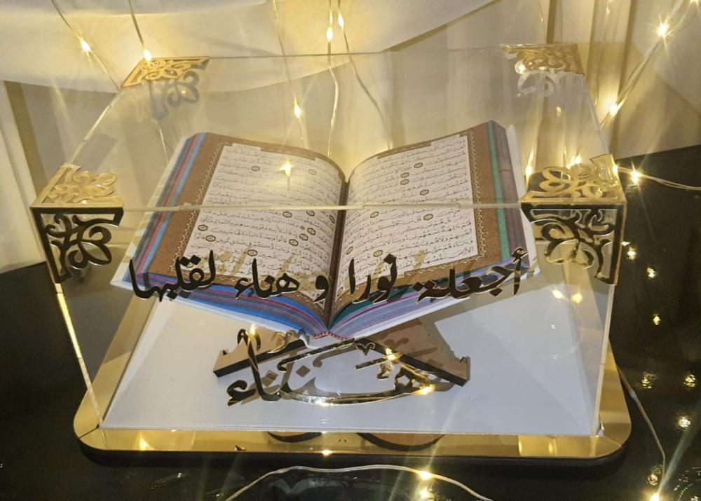 مصمم خصيصًا لعقد القران. يحتوي على مصحف أنيق موضوع بعناية داخل صندوق شفاف من الأكريلك الفاخر مع لمسات ذهبية وتصميم يحمل اسم العروسين أو عبارة مميزة.